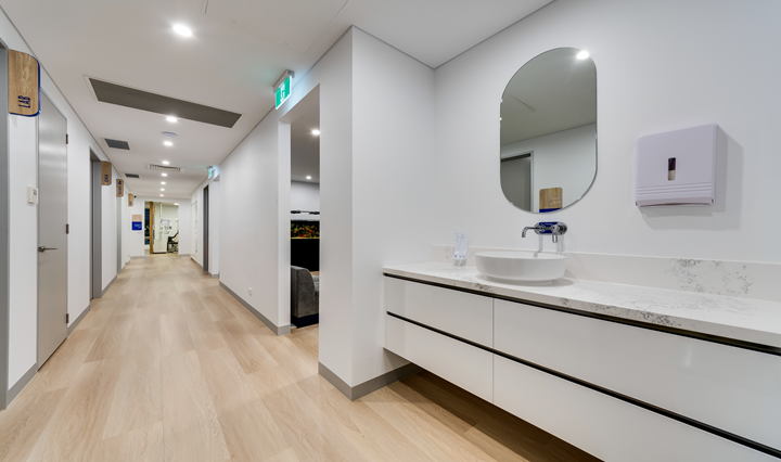 From the outset, OPTIMA's design team dedicated themselves to understanding the client's vision, resulting in a welcoming practice filled with light and prioritising patient comfort. The layout, featuring wide hallways radiating from a central waiting room, facilitates easy navigation, guiding patients seamlessly through different areas of the practice. Meticulous attention to detail is evident in every corner, with staff amenities designed to enhance well-being and treatment areas crafted for efficiency and tranquillity.Â