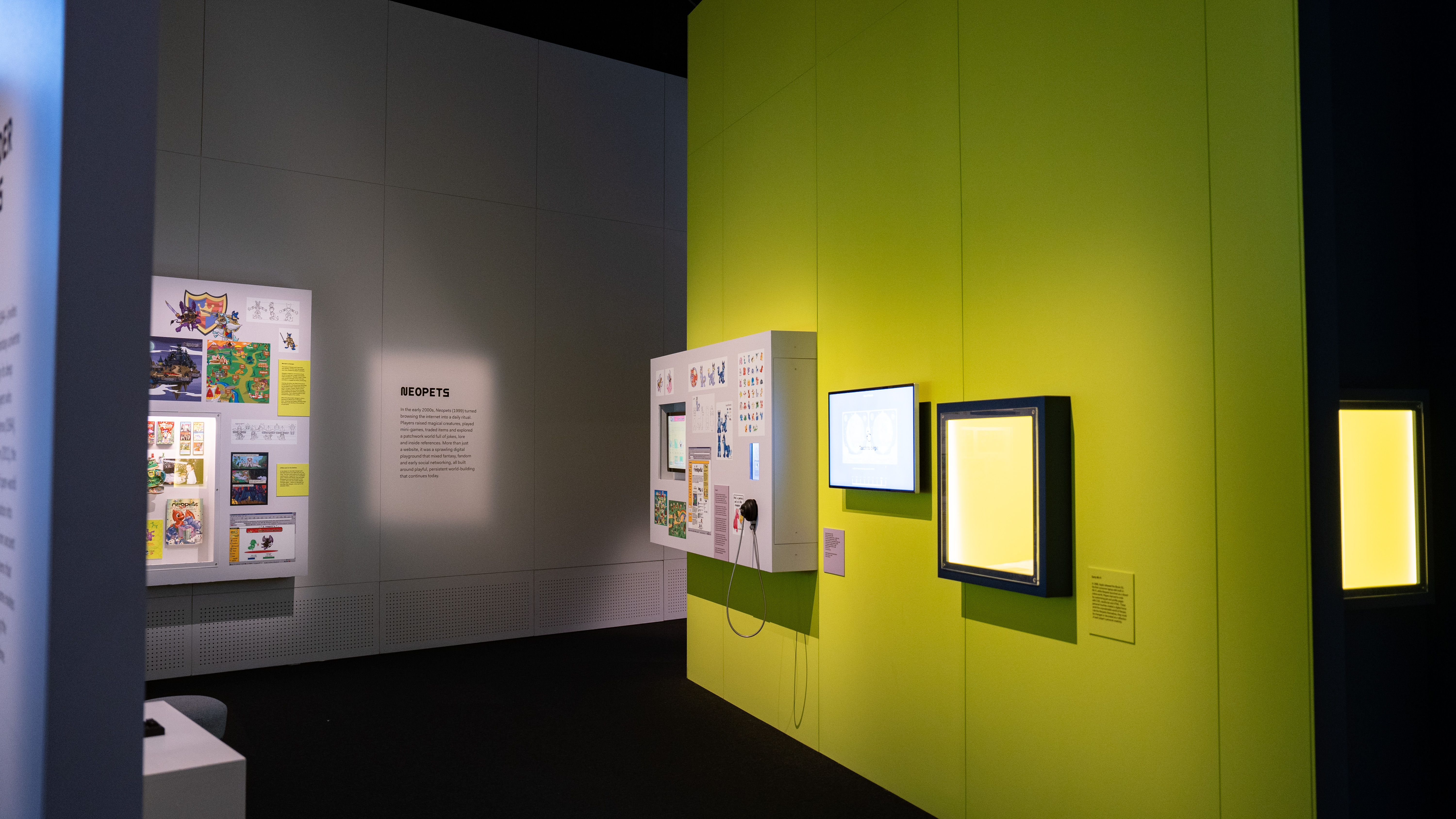The colours are used to guide visitor flow through the playable exhibition, navigating screen luminance, reflections, and variable sightlines, while also softening transitions between bright screens, and creating ‘rest’ zones so bold moments are more impactful. It is a balancing act between vibrancy and comfort, allowing visitors to enjoy longer sessions without visual fatigue.