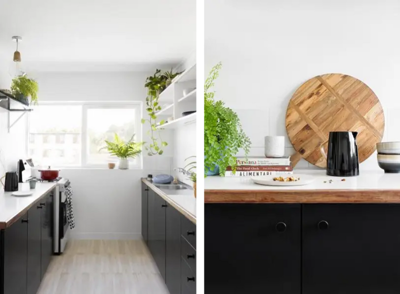 Last, but not least, a simple de-clutter and style will work wonders for updating your kitchen. Add some greenery (this is a must) and invest in a new crockery set. Clear off the bench tops (all the better to show off your new bench top) and add only a few key pieces intended for display. The rest should be hidden out of sight. Also highlight extra storage opportunities by styling to showcase how they might be useful for a potential renter/buyer.